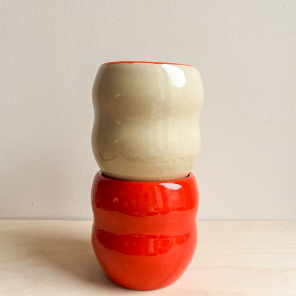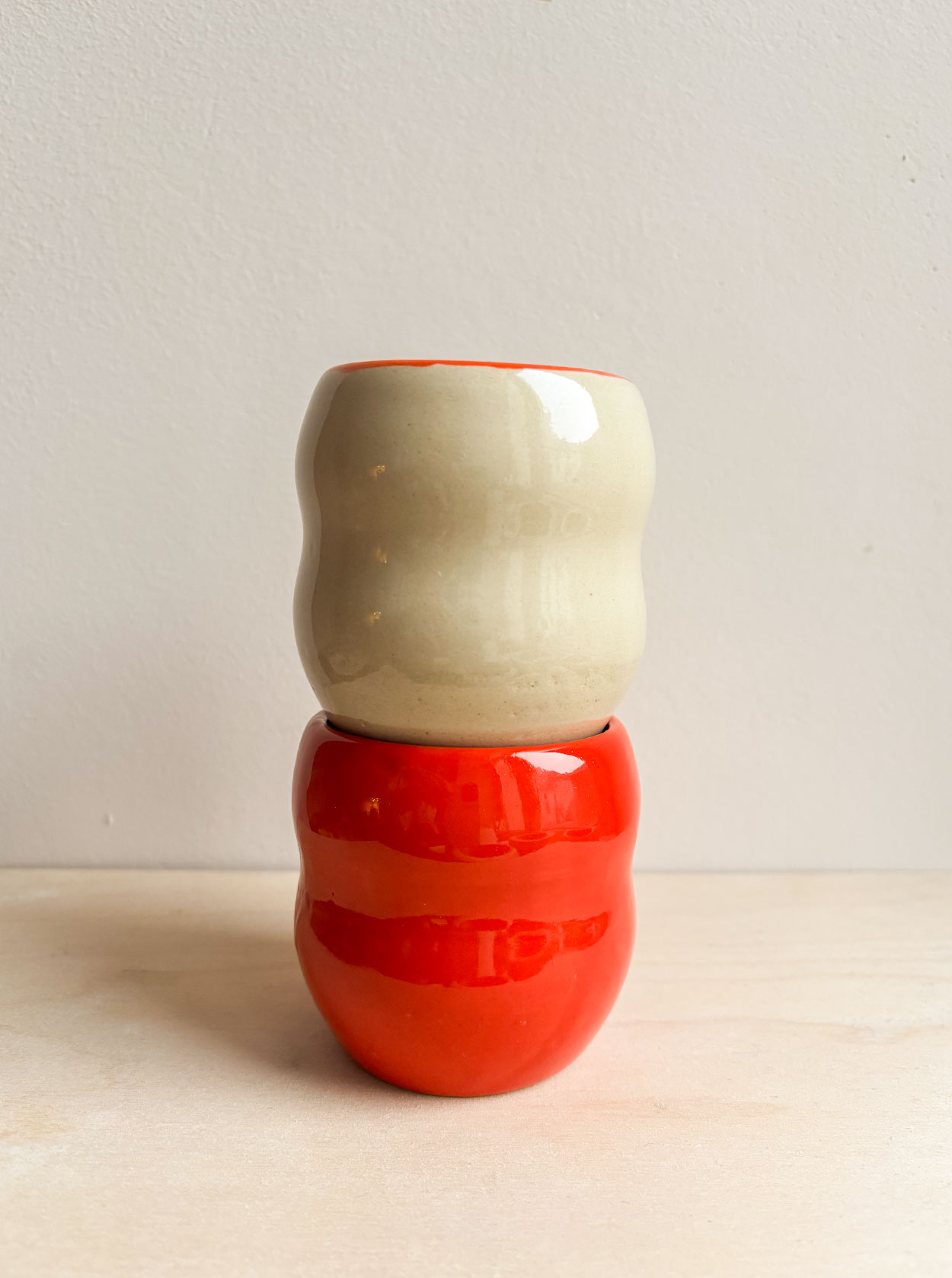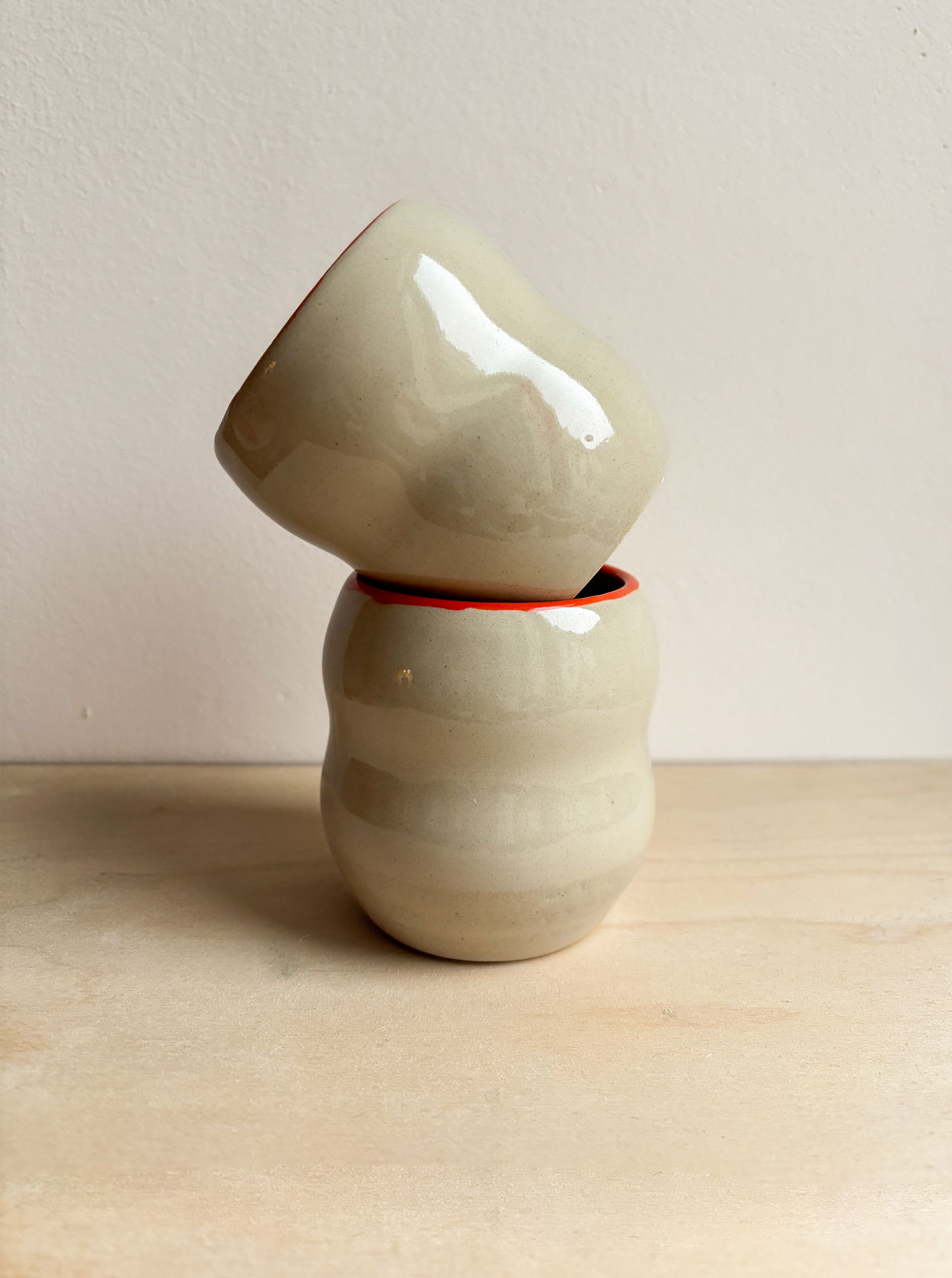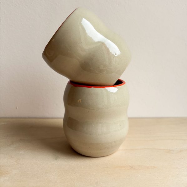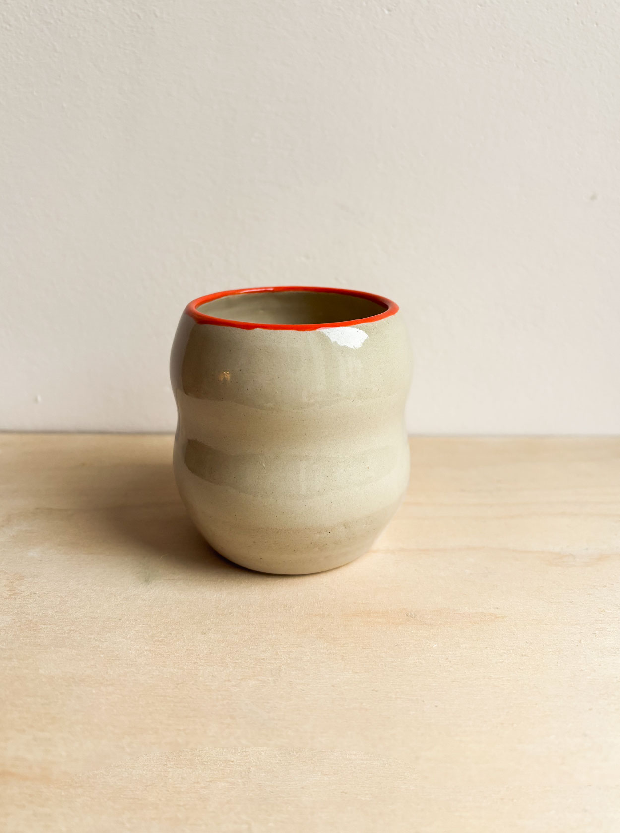 Czarka z brzuszkiem w naturalnym odcieniu gliny z pomarańczowym rantem. Idealna na małą kawę.