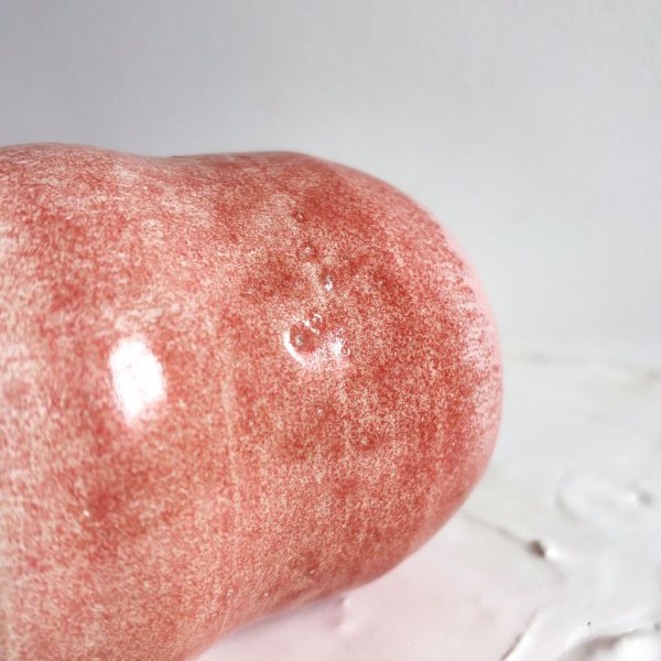 Kubek brzuszek w delikatnym odcieniu rożu. Posiada skazy na szkliwie w postaci bąbelków, nie wypływające na jego użytkownie.