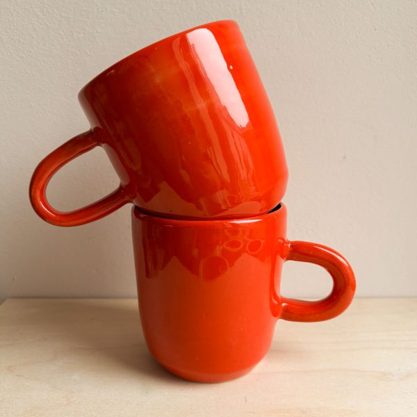Mini kubek z uchem toczony na kole garncarskim. Pokryty pomarańczowym, błyszczącym szkliwem. Idealny na małą czarną.